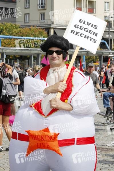 Demonstranten verschiedener Gruppen protestieren unter dem Motto 'Unteilbar: Für eine offene und freie Gesellschaft - Solidarität statt Ausgrenzung' gegen Rassismus, für soziale Gerechtigkeit und gegen Ausgrenzung am Altmarkt. Dresden, 24.08.2019