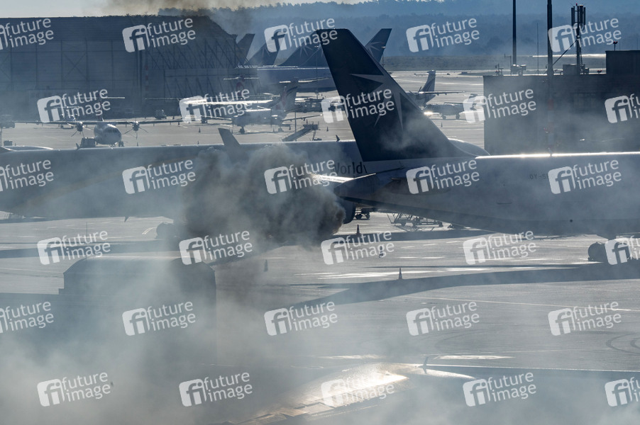 Explosion am Flugzeug bei der Notfallübung der Werkfeuerwehr, der Feuerwehr Köln und den Hilfsorganisationen am Flughafen Köln/Bonn. Im Rahmen der Übung wird die Kollision eines Flugzeugs mit einem Passagierbus und einer Abfertigungshalle simuliert. Einsatzkräfte retten aus dem in Brand geratenen Flugzeug und dem Gebäude Personen und versorgten diese. Köln, 06.11.2021