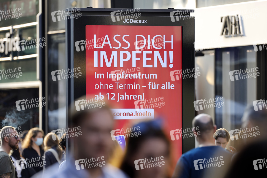 Die Stadt Köln wirbt auf Plakattafeln für ihr Impfangebot. Bürger ab 12 Jahren können sich ohne Termin in einem der Impfzentren oder mobilen Impfstellen ohne Voranmeldung impfen lassen. Über die Risiken werden Impflinge in einem Blatt aufgeklärt. Kritiker halten diese Aufklärung allerdings für unzureichend, da Langzeitstudien fehlen. (Themenbild, Symbolbild) Köln, 18.09.2021