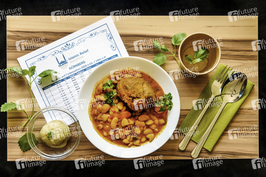 Ein Gericht mit Islamic Relief Fastenkalender 'Selbstdarstellung Gebets- und Fastenzeiten 2020 n.Chr. / 1441 n.H.' im Fastenmonat Ramadan