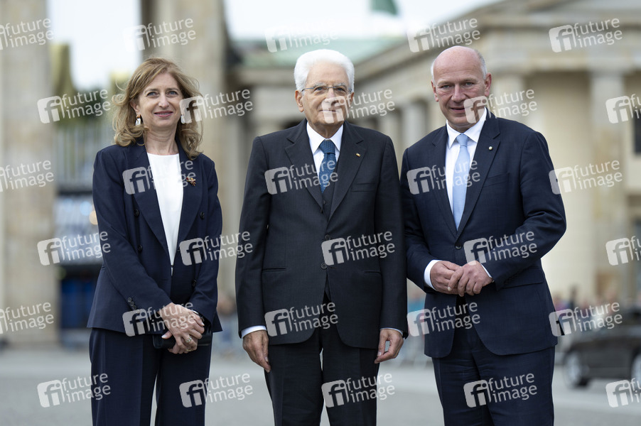 Laura Mattarella, Sergio Mattarella und Kai Wegner beim Empfang des Präsidenten der Italienischen Republik zum gemeinsamen Gang in Richtung Brandenburger Tor. Berlin, 27.09.2024