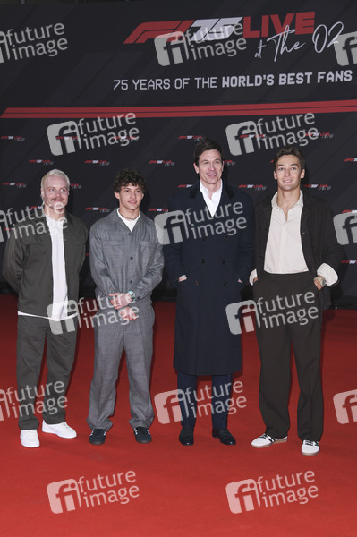 Valtteri Bottas, Andrea Kimi Antonelli, Toto Wolff und George Russell bei der Formel 1 Saison 2025 Eröffnungsfeier 'F1 75 Live' in der O2 Arena. London, 18.02.2025
