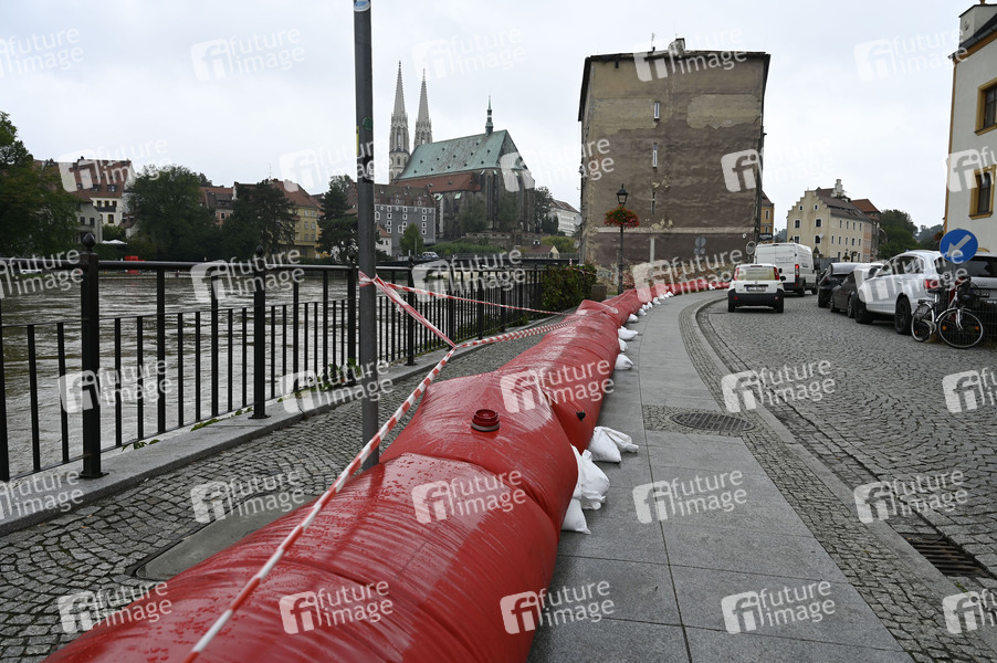 Ein mobiler Hochwasserschutz, mit Wasser befüllt, Nahe der der Altstadtbrücke. An der Neiße in Görlitz wurde am Morgen um 8:00 Uhr der Scheitelpunkt erreicht. Bei einem Wert von 5,57 m, bei einem Durchfluss von 309 m3/s, lag dieser 3 Zentimeter unterhalb der Alarmstufe 4. Seit dem geht der Wasserstand der Neiße langsam zurück. Der aktuelle Pegelstand beträgt 5,18 m. Görlitz, 16.09.2024
