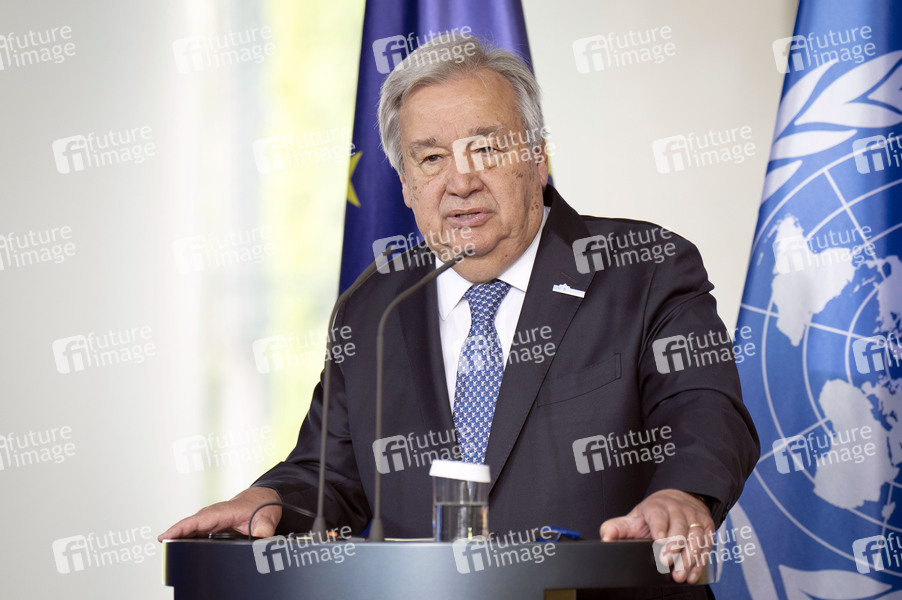 Antonio Guterres beim Empfang des Generalsekretärs der Vereinten Nationen zu einem gemeinsamen Gespräch mit dem Bundeskanzler mit anschließendem Pressestatement im Bundeskanzleramt. Berlin, 14.05.2025