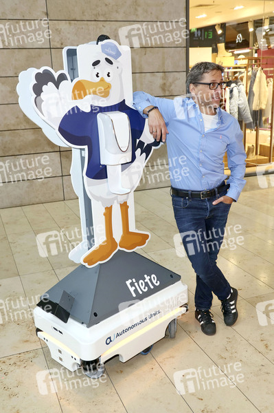 Patrick Bach beim Fototermin mit Service-Roboter 'Fiete', einem mobilen Spender für Hand-Desinfektionsmittel der Firma Autonomous Units, in der Europa Passage, Hamburg, 28.11.2022