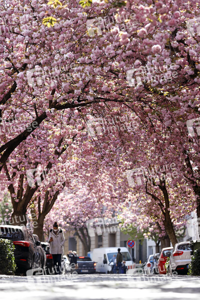 Passanten, Anwohner und Touristen bewundern die alljährliche Bonner Kirschblüte in der Bonner Altstadt rund um die Heerstraße. In diesem Jahr darf das Naturschauspiel nur unter Einhaltung strenger Corona-Maßnahmen beobachtet werden. Ordnungsamt und Polizei kontrollieren die Einhaltung von Maskenpflicht und Mindestabstand in den Gassen. Wenn der Andrang zu groß wird, sollen einzelne Straßen auch gesperrt werden. Bonn, 22.04.2021