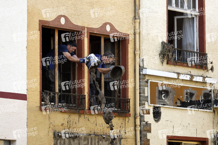 Nach dem Jahrhunderthochwasser in der Eifel durch heftige Regenfälle und Dauerregen mit Überschwemmungen und Überflutungen haben die Aufräumarbeiten im Ahrtal begonnen. Einheiten von Polizei, THW, Bundeswehr und Feuerwehr mitsamt vielen freiwilligen Helfern räumen Straßen, entfernen Schutt und Schlamm und versorgen die Menschen. Im Bild zerstörte Häuser in der Ortschaft Altenahr, in der die Flut viele Häuser zerstörte, 22.07.2021