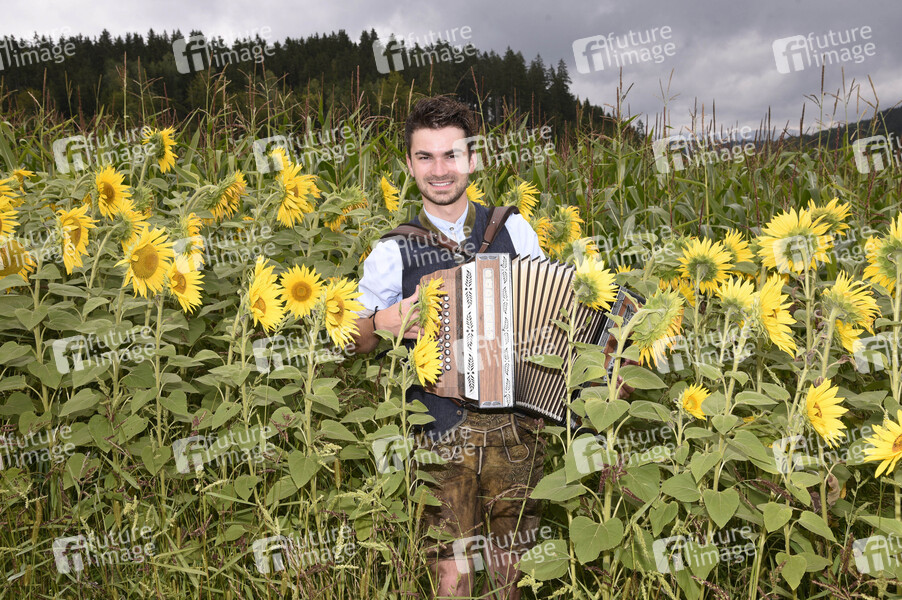 Entertainment, Prominenz, Celebrities, Celebrity, Homestory, Musiker, Akkordeonspieler, Sänger, Nachwuchskünstler in der volkstümlichen Musik, Schwarzhof, Bauernhof, Sonnenblumen, Sonnenblumenfeld