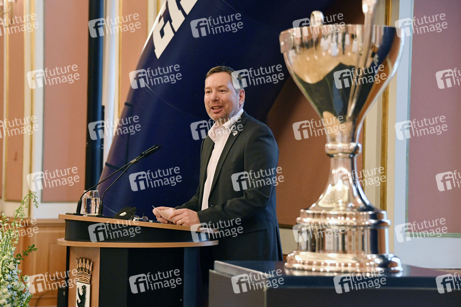 Thomas Bothstede bei Rede und Einzeichnungen der einzelnen Spieler, Trainer und Begleiter der Eisbären Berlin ins Gästebuch von Berlin aus Anlass des 8. Deutschen-Meister-Titels im Roten Rathaus. Berlin, 28.05.2021