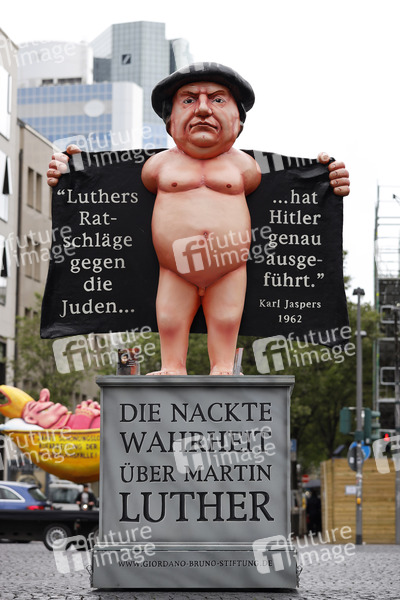 Eine Skulptur des Künstlers Jacques Tilly zeigt Martin Luther nackten Fettwanst. Der Künstler kritisiert damit den Antisemitismus in Luthers Abhandlungen. Frankfurt, 15.05.2021