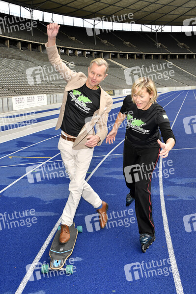 Max Raabe und Gesine Cukrowski beim Fototermin zur sportichen '#WocheChallenge' im Olympiastation Berlin. Unter dem Motto 'Wir können was bewegen!' ruft die Welthungerhilfe zu dieser Challenge auf und bittet um Spenden für eine Welt ohne Hunger. Berlin, 09.10.2020