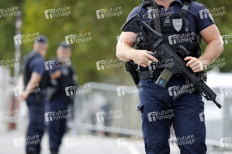 Einheiten der Nationalpolizei (CRS) patroillieren mit schweren Waffen in Paris. Paris, 29.07.2019