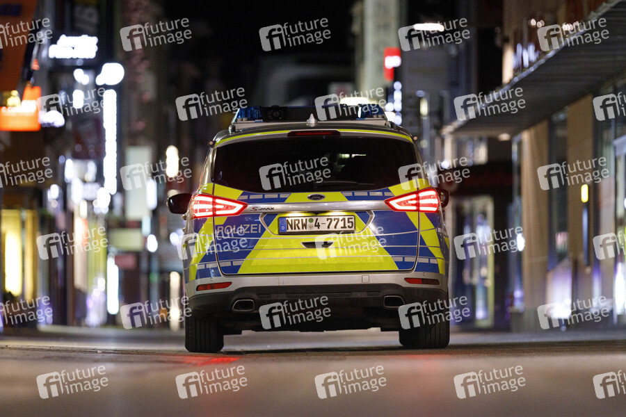 In Köln gelten seit dem 17.04.2021 um 0 Uhr Ausgangsbeschränkungen. Das Verlassen der Wohnung ist dann in der Zeit von 21 Uhr bis 5 Uhr fast ausnahmslos verboten. Die Beschränkungen beschloss der Krisenstab der Stadt Köln am Freitag. Ordnungsamt und Polizei kontrollieren die nächtlichen Straßen wie die Einkaufsstraße Hohe Straße im Bild. (Themenbild, Symbolbild) Köln, 17.04.2021