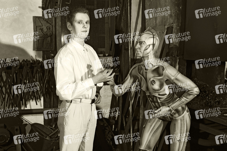 GEEK ART - Bodypainting and Transformaking: Metropolis Photoshooting mit Sarah Specker als Menschmaschine und Paul Skupin als Käufer des Roboters in der Roboter-Schmiede Brütt in Eldagsen. - Ein Projekt des Fotografen Tschiponnique Skupin und des Bodypainters und Transformakers Enrico Lein