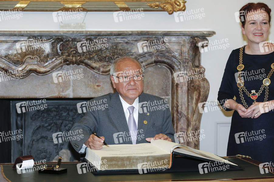 Shun'ichi Suzuki und Katja Dörner beim Bildtermin vom Eintrag einiger G7-Finanzminister und Notenbankgouverneure ins Goldene Buch der Stadt Bonn im Alten Rathaus. Bonn, 19.05.2022