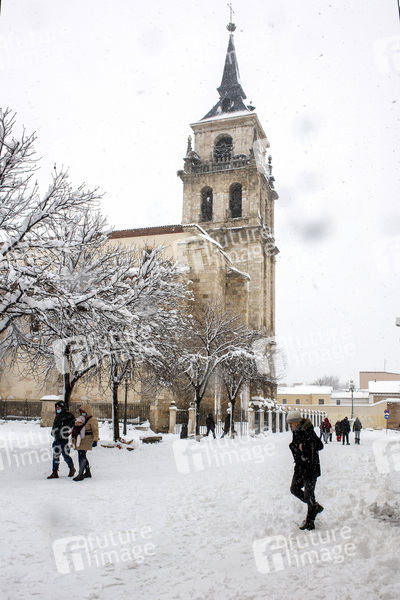 Plaza de Cervantes - Die Region Madrid nach dem Sturmtief Filomena, das in weiten Teilen Spaniens mit starken Schneefällen für Chaos sorgte. Starker Schneefall legte das öffentliche Leben nahezu lahm. Seit 50 Jahren hatte es nicht so geschneit. Alcalá de Henares, 10.01.2021