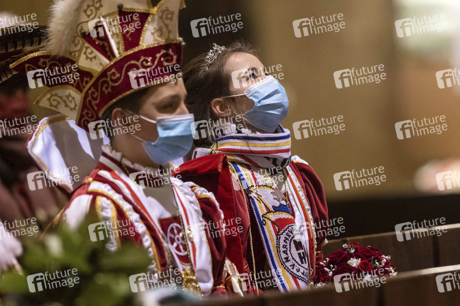 Der karnevalistische Gottesdienst fand unter 3G-Bestimmungen in der Severikirche auf dem Erfurter Domberg statt. Pfarrer Michael Neudert, gab den Karnevalisten, einschließlich den Prinzenpaaren Christian II. und Verena II. und den Kindern Luca I. und Noelanie I. den Segen für die anstehende Kampagne. (Personen im Bild: v.l. Kinderprinzenpaar Luca I. und Noelani I.). Erfurt, 16.01.2022