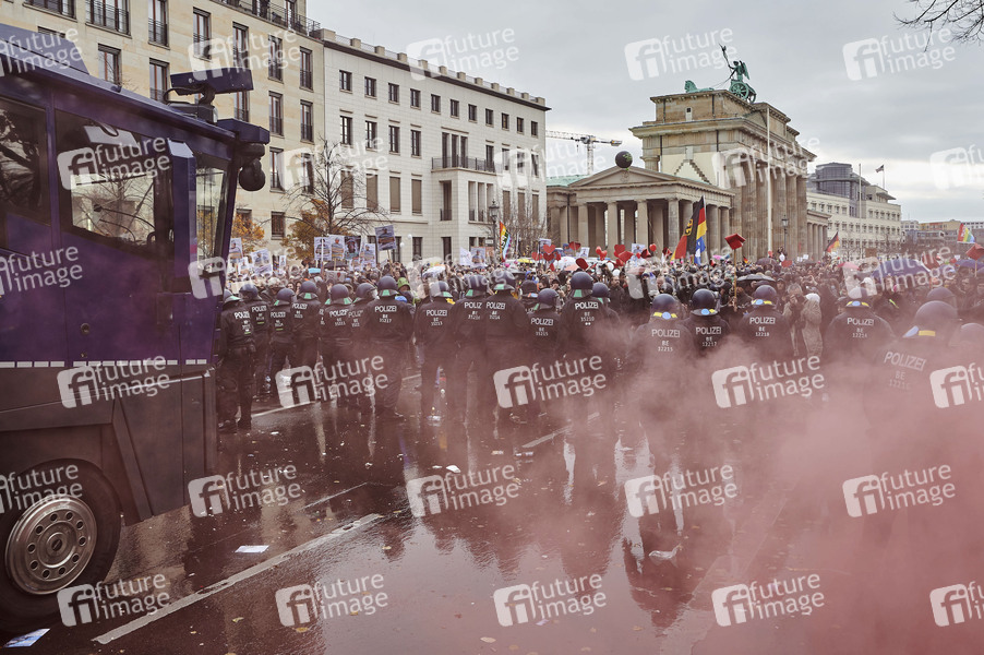 Tausende Demonstranten protestieren am Brandenburger Tor und im Regierungsviertel gegen die Corona-Politik der Regierung anlässlich der Bundestagsitzung zum Infektionsschutzgesetz. Die Polizei löst den Protest auf. Dabei kommt es zu Festnahmen, dem Einsatz von Wasserwerfern und Verstößen gegen die Maskenpflicht. Proteste in unmittelbarer Nähe des Bundestags waren zuvor untersagt worden. Berlin, 18.11.2020
