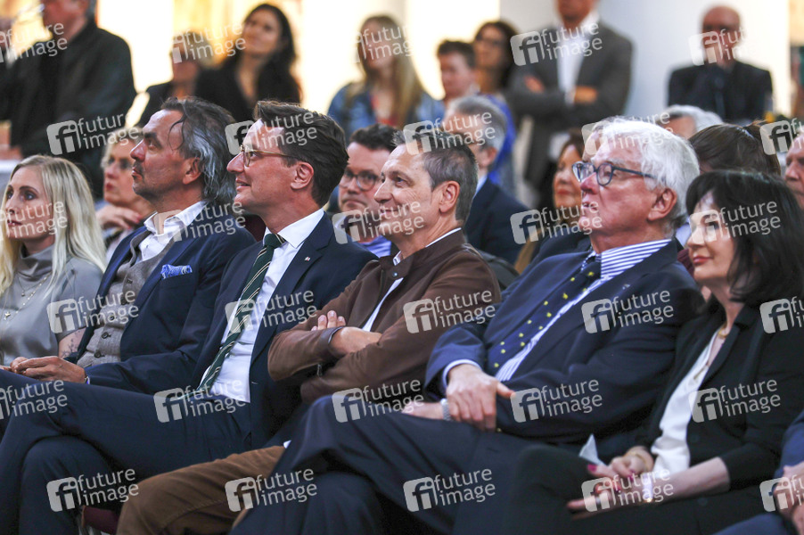Stefanie Berger, Boris Berger, Hendrick Wüst, Dieter Nuhr, Bodo Hombach und Ingrid Winter bei der Präsentation der Wanderausstellung 'Woanders ist überall' mit Gemälden über die Geschichte und Kultur des Ruhrgebiets von Dieter Nuhr in der Kreuzkirche. Essen, 28.05.2024