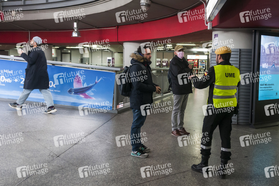 Die spanische Regierung hat den Ausnahmezustand wegen des Coronavirus COVID-19 erklärt. Die Bevölkerung steht 15 Tage zu Hause unter Quarantäne. Die spanische Polizei und Armee überprüfen Menschen, die durch die Straßen gehen. Erlaubt sind Gänge in Krankenhaus, in Supermärkte, Kioske und Apotheken, sowie das Ausführen von Haustieren und der Weg zur Arbeit. Madrid, 19.03.2020