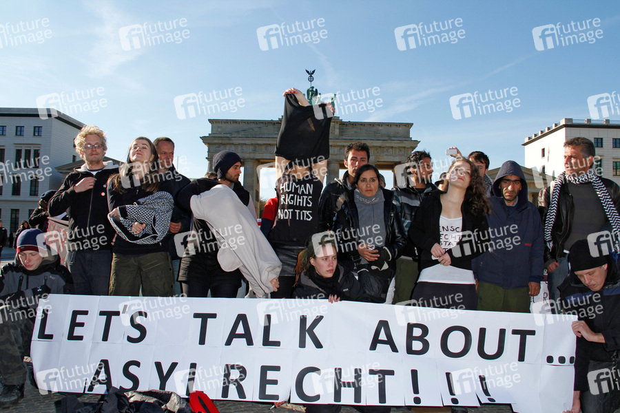 Flüchtlinge und Aktivisten, die vor dem Brandenburger Tor für eine neue Asylpolitik demonstrieren, werden von Politkerinnen der Piratenpartei unterstützt, Berlin