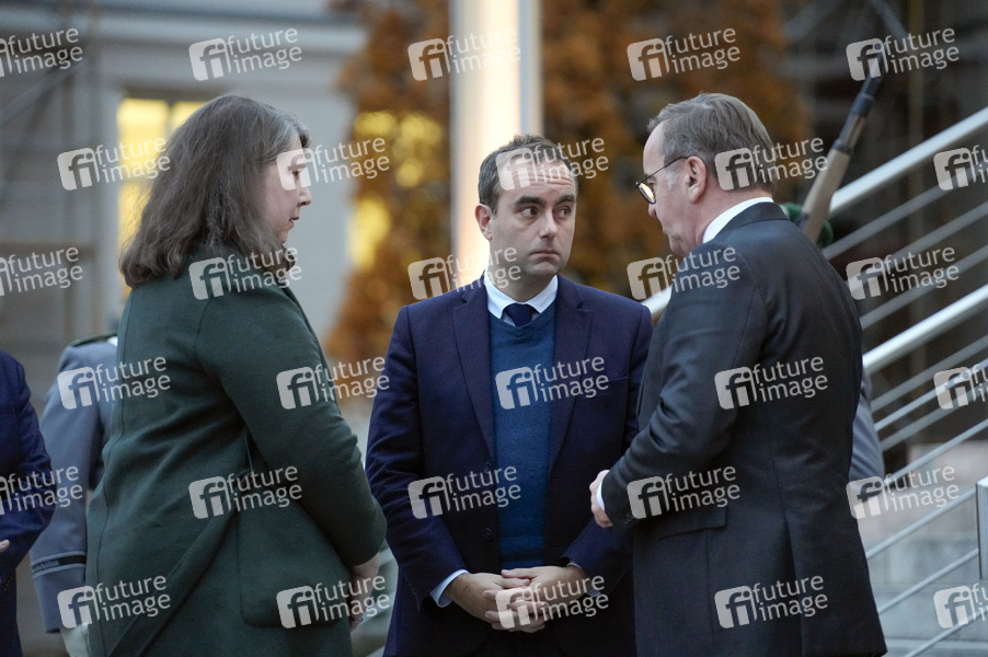 Sebastien Lecornu und Boris Pistorius beim Treffen zum Gespräch mit Amtskollegen und einer Unterstaatssekretärin aus vier europäischen Ländern über die Stärkung der europäischen Sicherheit und Verteidigung mit anschließendem gemeinsamen Pressestatement im Bundesministerium der Verteidigung. Berlin, 25.11.2024