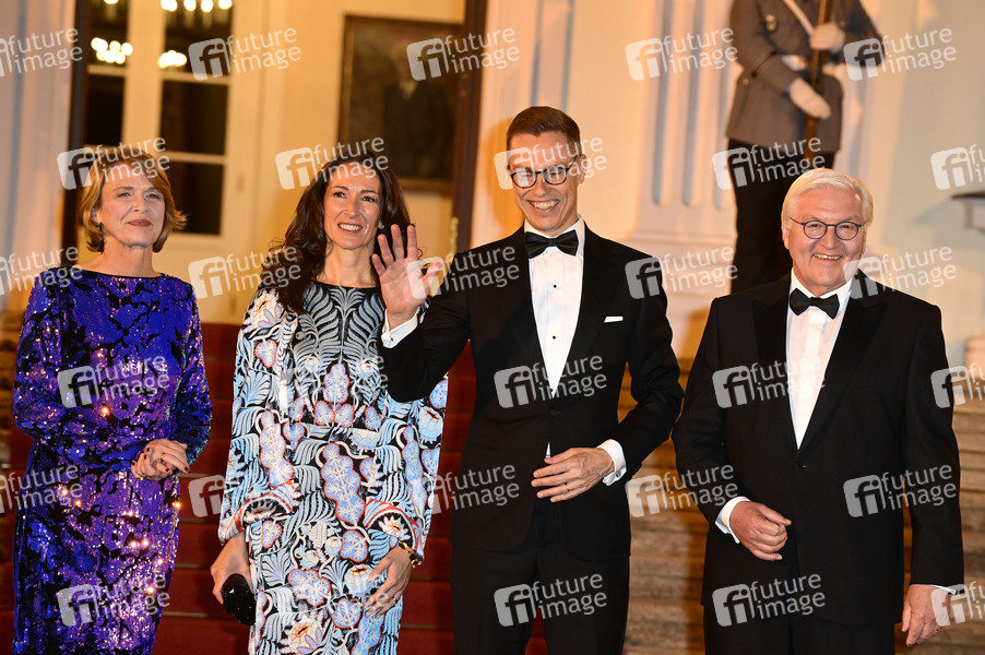 Elke Büdenbender, Suzanne Elizabeth Innes-Stubb, Alexander Stubb und Frank-Walter Steinmeier bei der Ankunft zum Abendessen anlässlich des 25. Jubiläums der Nordischen Botschaften im Schloss Bellevue. Berlin, 21.10.2024