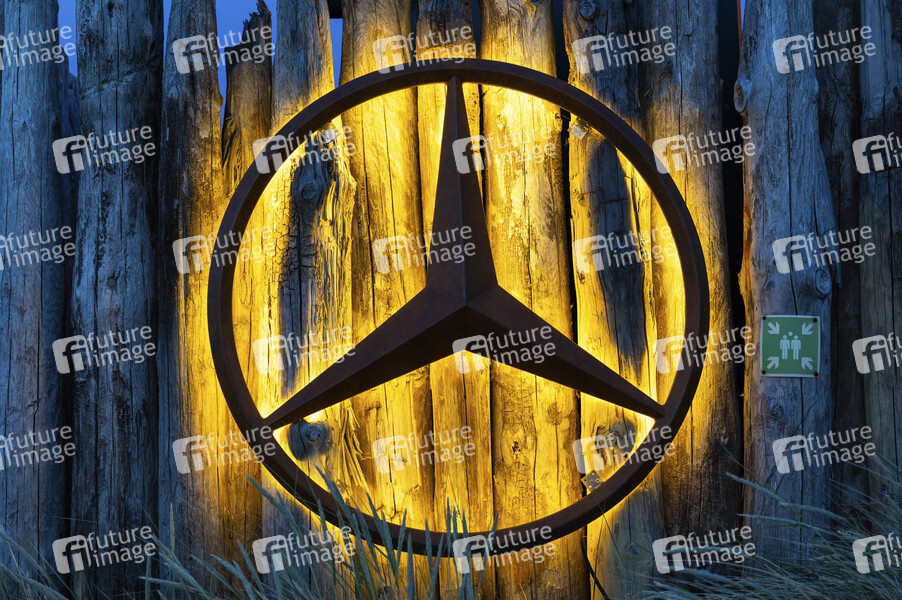 Beleuchtetes Mercedes Logo an einem Holzzaun. (Symbolfoto, Symbolbild) Kampen, 26.08.2025