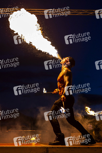 Die Feuershow 360GradEvent bei den Pyro Games 2024 - Feuer, Licht, Laser. Das Duell der Feuerwerker auf dem Messegelände. Erfurt, 17.06.2024