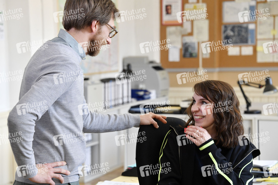 Hendrik von Bültzingslöwen und Caroline Erikson beim Fototermin am Set der 2. Staffel der ZDF Serie 'Soko Potsdam' im Polizeipräsidium. Potsdam, 09.04.2019