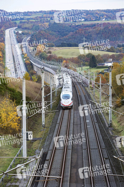 Hallerbachtalbrücke, Mobilität, Eisenbahn vs. Auto, Autobahn, Bundesautobahn, A3, Schnellfahrstrecke, Hochgeschwindigkeitstrasse, Geschwindigkeit, ICE, ICE-Strecke, Deutsche Bahn, Eisenbahn, Streckenkilometer 50, Spannbeton-Hohlkastenbrücke, Brückenbauwerk, E -Mobility, End-to-End-Tourismus, Langsamverkehr, Stau, Mixed Mobility, Zukunft, Umwelt, Diesel, Benzin, Ökostrom, Urlaub, Beton, Städteverbindung, Fahrzeuge, Wagons, Personenverkehr, Fernverkehr, Flughafenzubringer, Klimaziele, Verkehr, Symbolbild, Symbolfoto