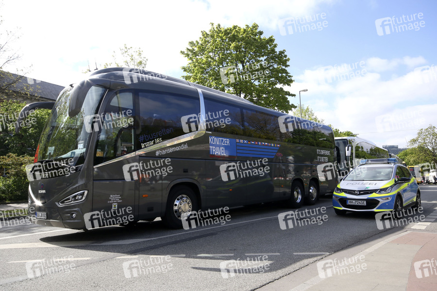 Unter dem Motto 'Rettung der flexiblen und individuellen Reise-Busbranche' demonstrieren Busunternehmer aus Norddeutschland mit einem Konvoi von Reisebussen gegen die aktuellen Reisebeschränkungen aufgrund der Corona-Pandemie. Hamburg, 07.05.2020
