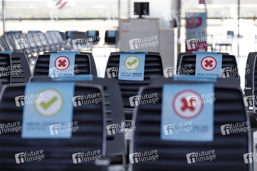 Wartebereich mit Schildern zum Social Distancing bei der Vorstellung des Sicherheitskonzepts am Flughafen Köln Bonn während der Coronakrise 'Sicher in Corona Zeiten'. Köln, 27.05.2020