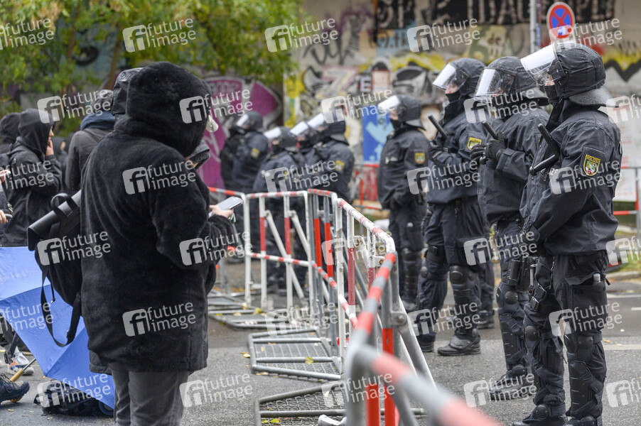 Räumung des linksautonomen Wagenplatzes 'Köpi'. Die Bewohner hatten im Vorfeld angekündigt, sie wollen nicht kampflos aufgeben. Rund eine Stunde haben die Barrikaden des linksautonomen Wagencamps gehalten, dann durchbrach die Polizei den Zaun an mehreren Stellen. Es gab Festnahmen. Berlin, 15.10.2021