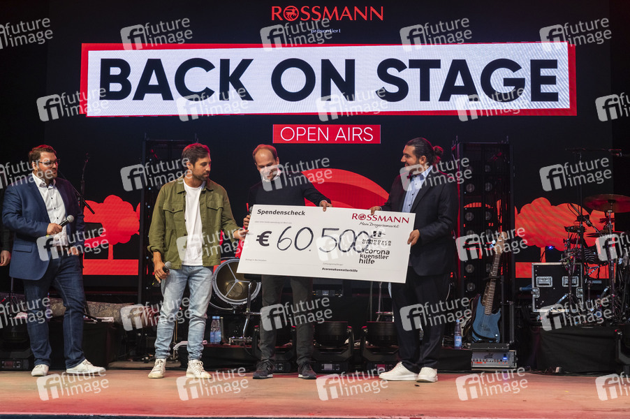 Max Giesinger, Raoul Roßmann und Nico Röger bei der Scheckübergabe vor dem Max Giesinger Charitykonzert im Rahmen der Konzertreihe 'Back on Stage' auf der Gilde Parkbühne. Hannover, 13.09.2021