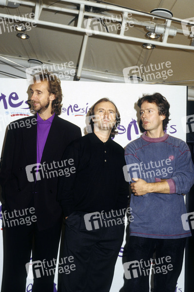 Tony Banks, Phil Collins und Mike Rutherford von Genesis beim Pressetermin zur Genesis 'We Can't Dance' European Tour '92 in der Imagination Gallery. London, 21.11.1991