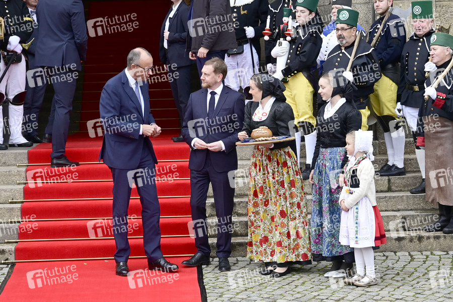 Friedrich Merz und Michael Kretschmer beim Antrittsbesuch des Bundeskanzlers im Freistaat Sachsen in der Sächsischen Staatskanzlei. Dresden, 28.10.2025