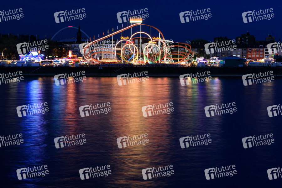 Kirmes, Lichter, Freizeit, Rummel, Volksfest, Unterhaltung, Rummelplatz, Jahrmarkt, Fahrgeschäft, Vergnügen, Looping, Vergnügung, Vergnügungsfahrgeschäft, Vergnügungssteuer, Achterbahn, Rollercoaster, Frühlingsfest, Fahrgeschäft, Fliehkräfte, Fliehkraft, Karussell, Riesenrad, Fliehkräfte, G-Kräfte, G-Force, Höhenangst, Beschleunigung, Fliehkraft, Rheinufer, Symbolbild, Symbolfoto