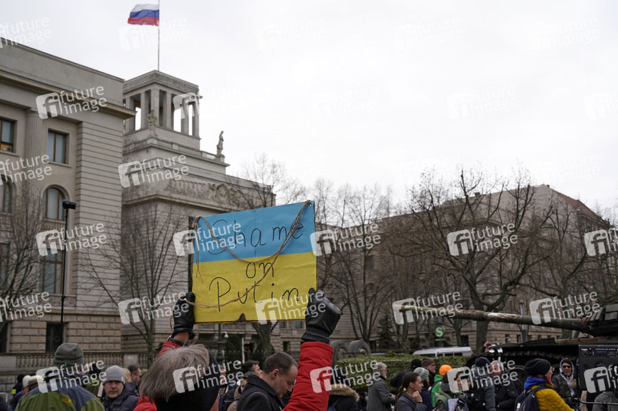 Politik, Krieg, Russland, Ukraine, Jahrestag, Protest, Protestaktion, Frieden, Demonstration, PK, T-72 B1 Panzer, Panzerwrack