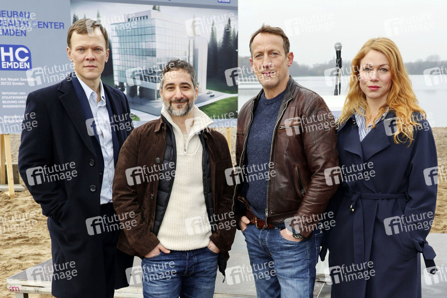 Sebastian Hülk, Denis Moschitto, Wotan Wilke Möhring und Esther Roling beim Fototermin am Set der Doppelfolge des ARD-Krimis 'Tatort - Ein guter Tag / Schwarzer Schnee' am Eichbaumsee in Moorfleet. Hamburg, 27.11.2024