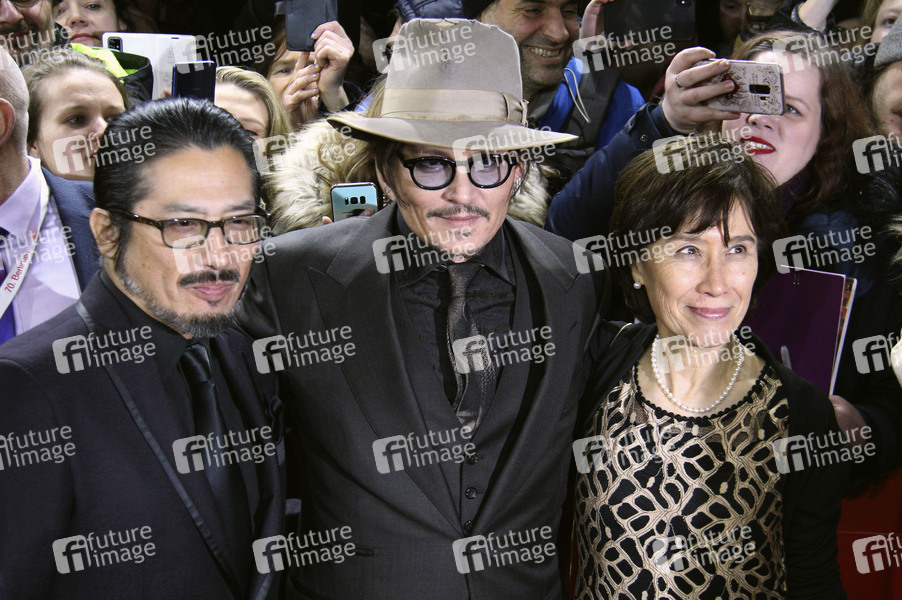 Hiroyuki Sanada, Johnny Depp und Aileen Mioko Smith bei der Premiere des Kinofilms 'Minamata' auf der Berlinale 2020 / 70. Internationale Filmfestspiele Berlin im Friedrichstadt-Palast. Berlin, 21.02.2020