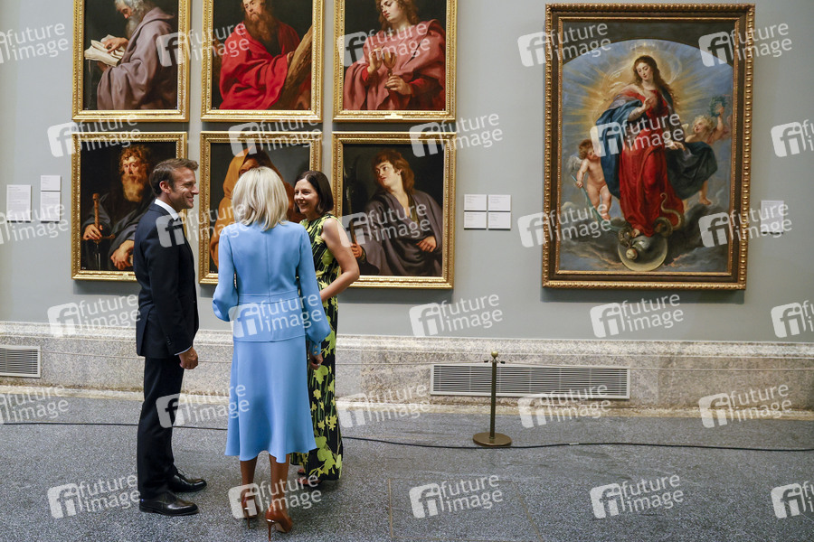 Emmauel Macron, Brigitte Macron und Annik Penders bei der Ankunft zu einem informellen transatlantischen Abendessen der NATO Staats- und Regierungschefs im Prado-Museum. Madrid, 29.06.2022