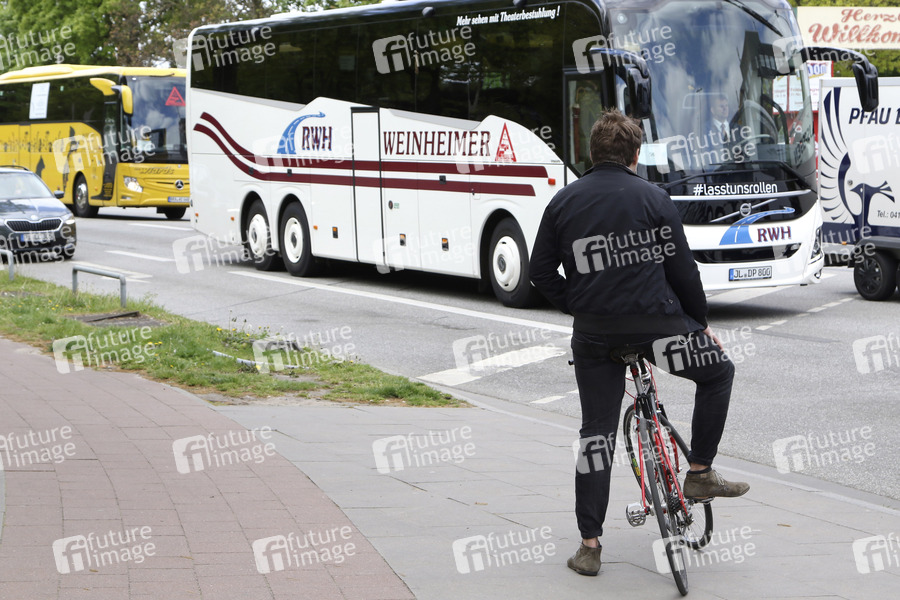 Unter dem Motto 'Rettung der flexiblen und individuellen Reise-Busbranche' demonstrieren Busunternehmer aus Norddeutschland mit einem Konvoi von Reisebussen gegen die aktuellen Reisebeschränkungen aufgrund der Corona-Pandemie. Hamburg, 07.05.2020