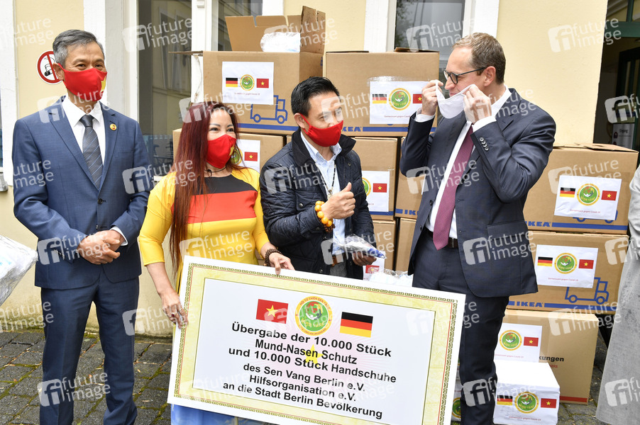 Nguyen Minh Vu, Duong Thi Bich Ngoc, Tran Manh Hung und Michael Müller bei der Entgegennahme der Spende von Masken und Handschuhen des vietnamesischen Wohltätigkeitsvereins Hoi tu thien Sen Vang Berlin in Pankow. Berlin, 25.05.2020