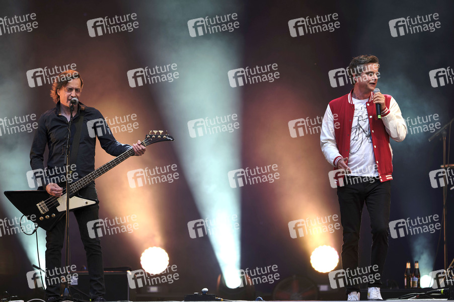 Kai Schiering und Oliver Perau von Terry Hoax live beim Autokultur-Konzert auf dem Schützenplatz. Die Besucher verfolgen unter Berücksichtigung klarer Hygiene-Vorschriften während der Corona-Krise den Auftritt aus dem Auto. Hannover, 10.05.2020