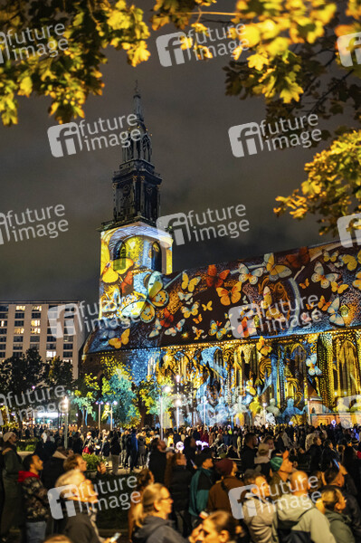 Die Marienkirche. Das Festival of Lights Berlin gehört zu den bekanntesten Lichtfestivals weltweit. Es ist ein kostenloser Event in Berlin, der jährlich im Herbst stattfindet und 10 Tage lang bekannte Berliner Sehenswürdigkeiten durch Illuminationen, lichtkünstlerische Projektionen und 3D-Mappings aufwändig in Szene setzt. Berlin, 06.10.2024