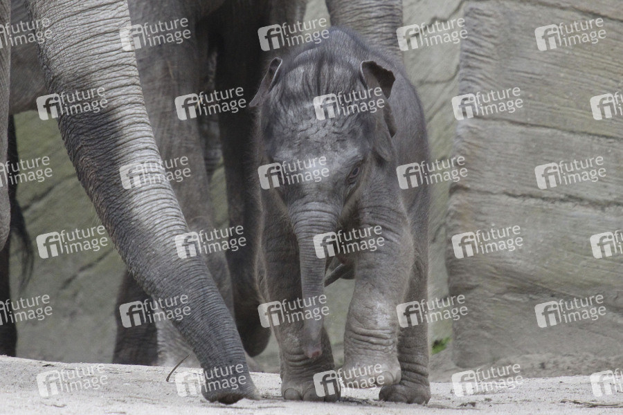 Der am 13. April geborene Elefant bei seinem ersten Freigang auf der 3000 Quadratmeter großen Außenanlage im Tierpark Hagenbeck, Hamburg