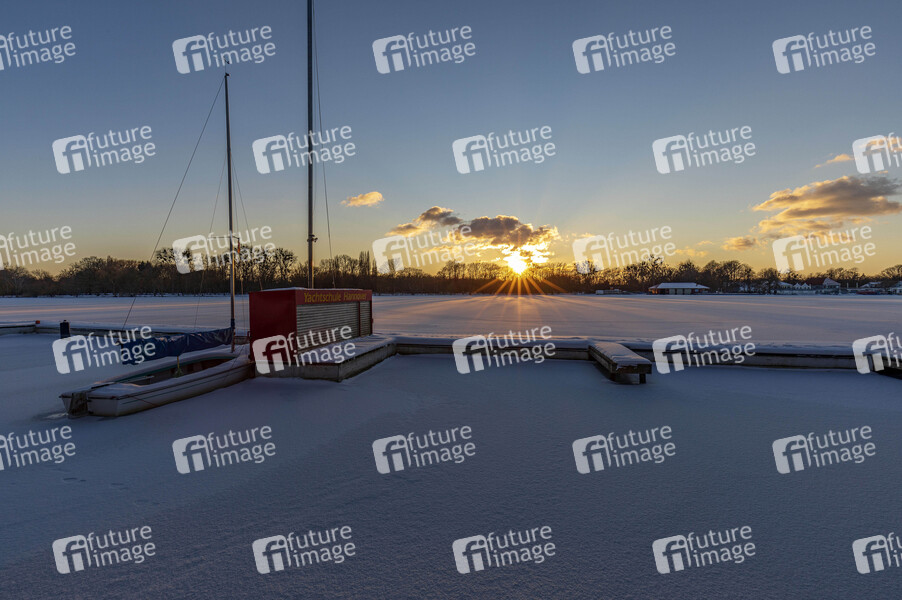 Der zugefrorene Maschsee in Hannover. Das Eis trägt aber noch nicht, die Stadt Hannover warnt vor dem Betreten der Eisfläche. Die Eisfläche ist nur ein paar Zentimeter dick es besteht höchste Lebensgefahr Hannover, 12.02.2021