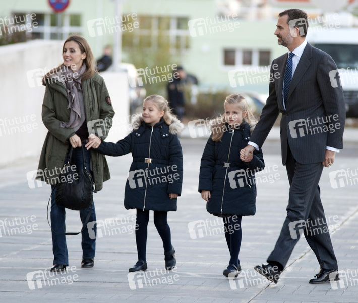 Prinzessin Letizia, Prinzession Sofia, Prinzessin Leonor und Prinz Felipe beim Besuch von König Juan Carlos im Quiron Universitätskrankenhaus. Pozuelo de Alarcon, 22.11.2013