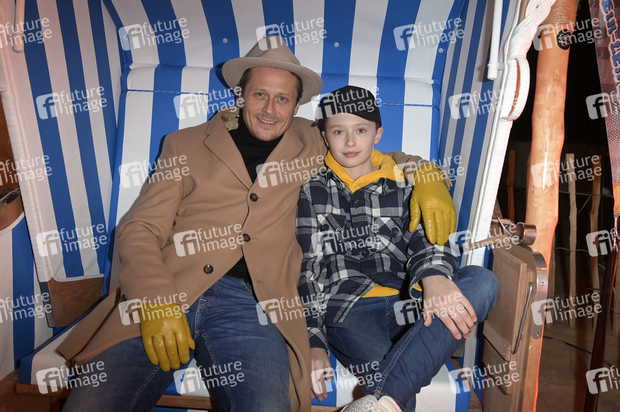 Roman Knizka mit Sohn Leo Knizka beim offiziellen Opening der Baltic Lights 2024 mit Fackellauf und Lagerfeuer an der Alex Strandbar. Heringsdorf, 01.03.2024